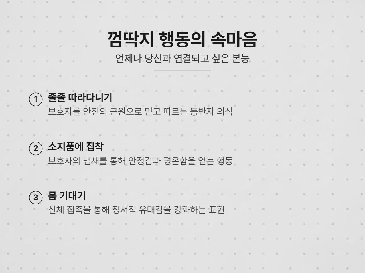 - 안전지대 인식: 보호자와 함께라면 어디든 안전하다고 믿는 본능입니다.