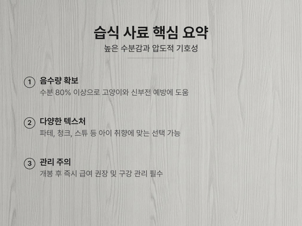 | 습식 | 80% 이상 | 음수량 최고, 고기 식감 | 높은 가격, 유통기한 짧음 |