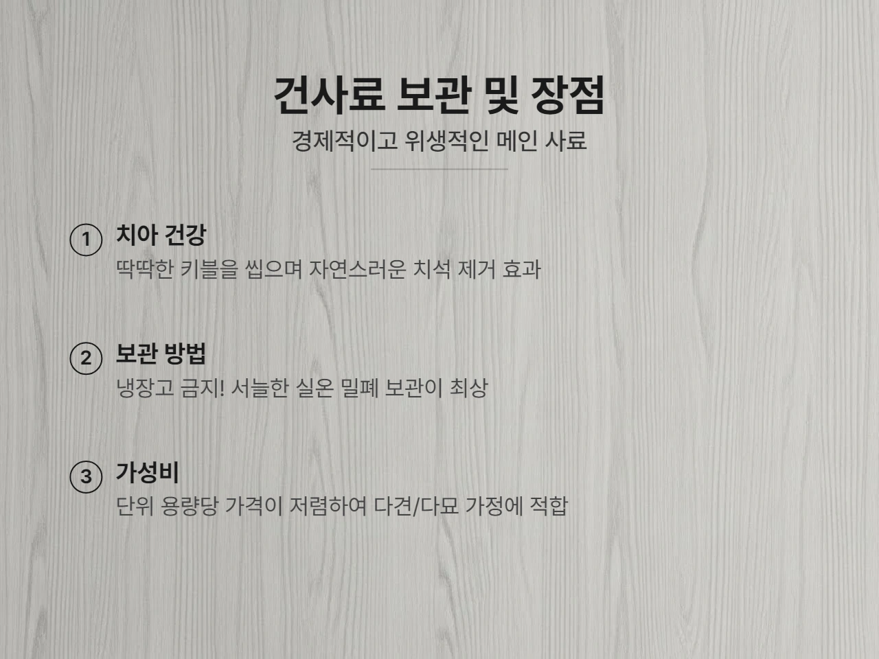 건사료의 장점을 요약하면 다음과 같습니다.