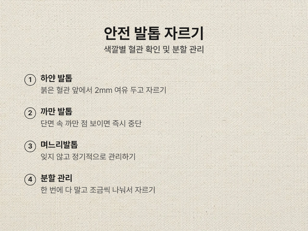 - 정기적 관리: 다른 발톱과 함께 주기적으로 꼭 관리해야 합니다.