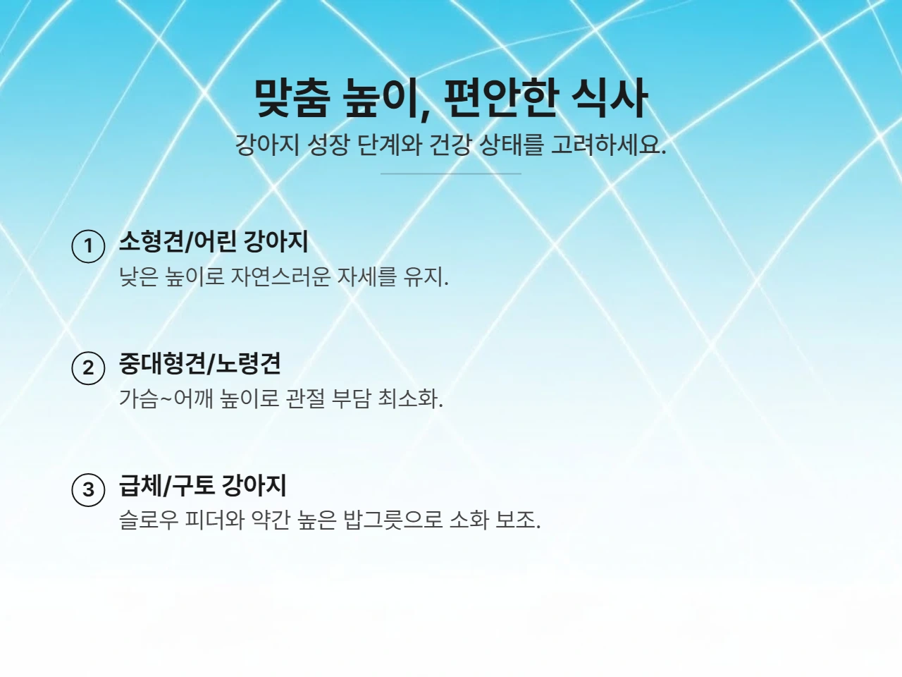 • 턱관절 문제 강아지: 입을 크게 벌리지 않아도 편안하게 먹을 수 있도록, 턱관절에 부담이 가지 않는 높이와 각도를 찾아주는 것이 핵심입니다.