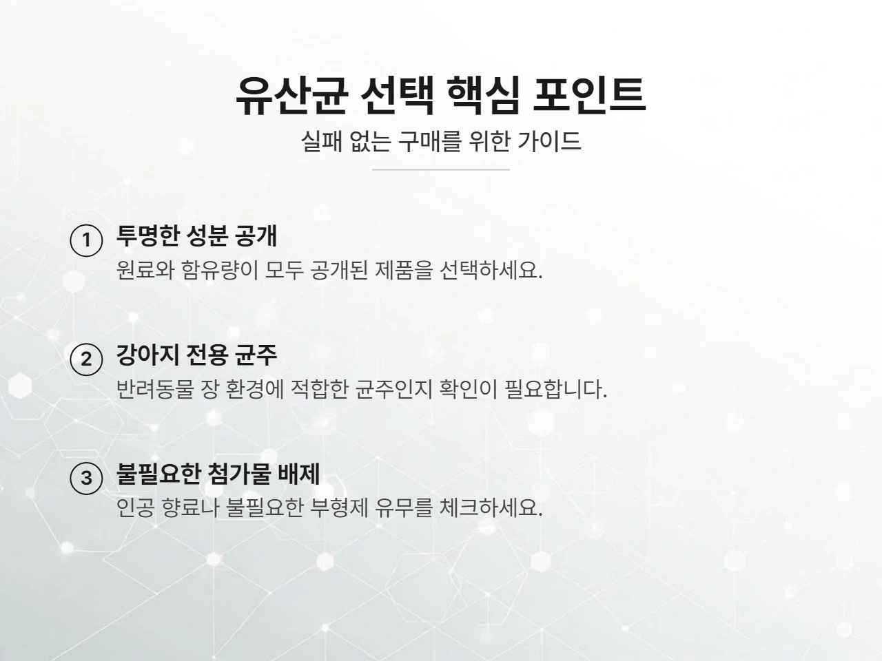 강아지 유산균을 고를 때 제가 가장 중요하게 생각한 것은 단순히 '유명세'가 아니었어요. 소중한 반려견의 몸에 직접 들어가는 만큼, 무엇보다 투명성과 적합성을 최우선으로 따져보았습니다.