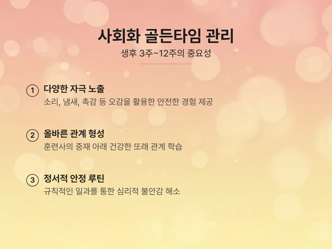 보통 강아지 사회화의 '황금기'는 생후 3주부터 12주(약 4개월) 사이라고 알려져 있습니다. 이 시기에 겪는 다양한 경험과 자극은 평생의 성격과 행동 양식을 결정짓는 아주 중요한 역할을 합니다.