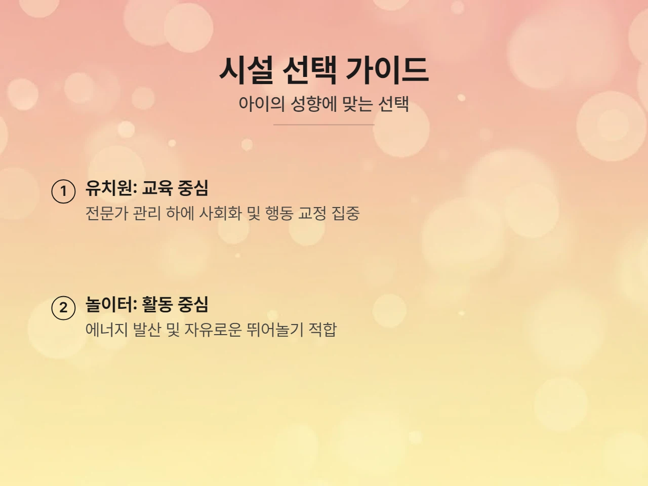 - 유치원: 교육 중심, 전문가 관리, 예약제 운영 위주