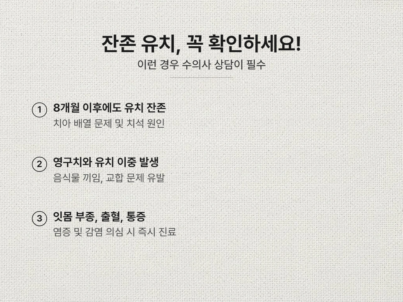 - 음식물 끼임 및 치석 형성: 유치와 영구치 사이에 음식물이 쉽게 끼어 치석이 빠르게 쌓이고 잇몸 염증을 유발합니다.