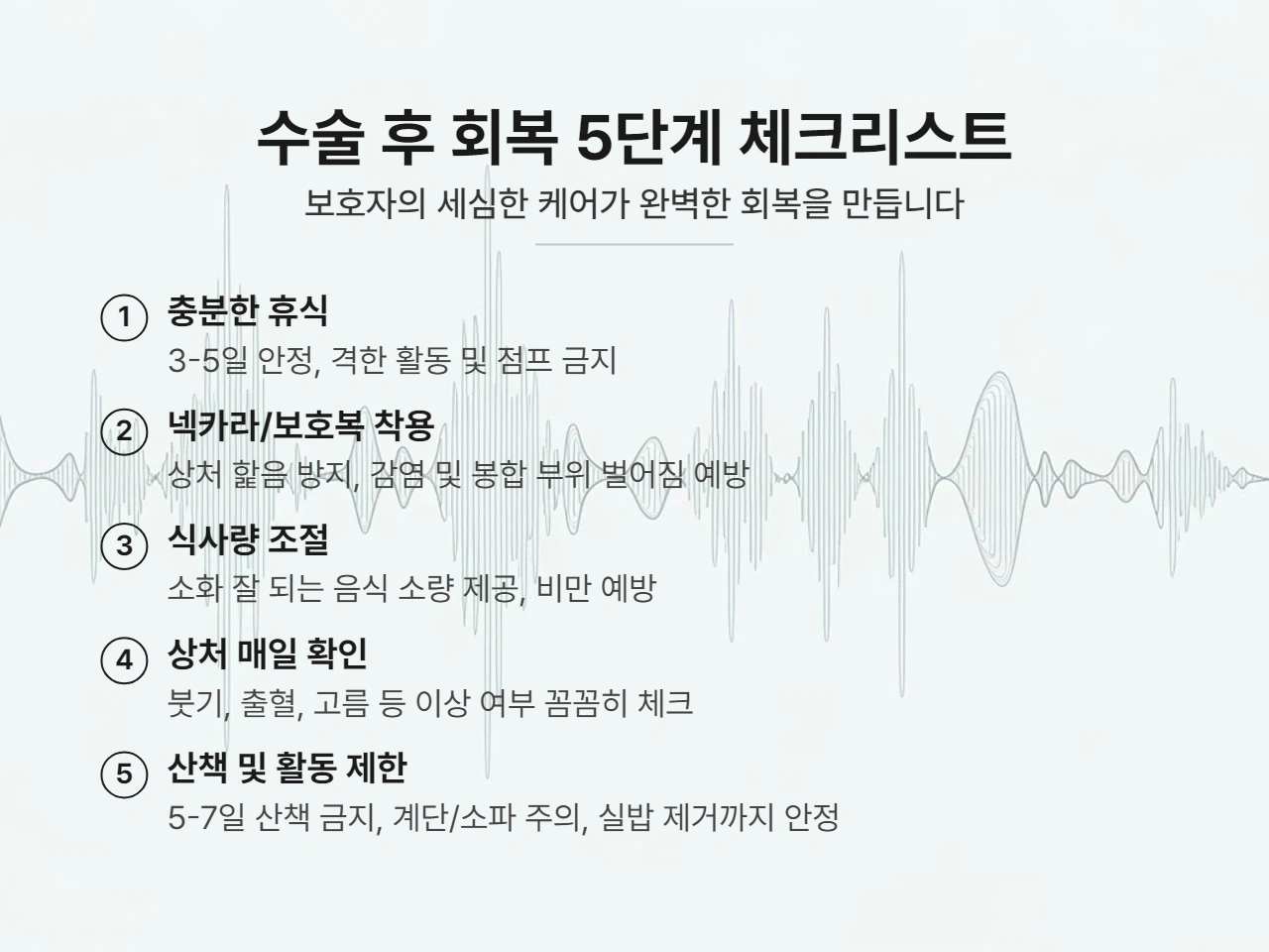 복돌이의 재봉합 사건을 겪으면서 수술 후 관리가 얼마나 중요한지 몸소 깨달았습니다. 다음 체크리스트를 통해 우리 아이의 회복을 빈틈없이 도와주세요.