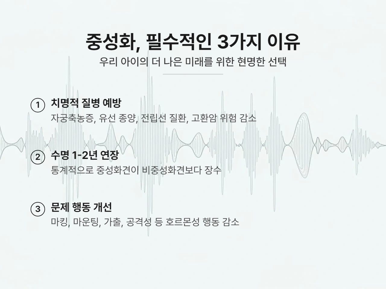 - 주요 예방 질환: 자궁축농증, 유선 종양, 원치 않는 임신