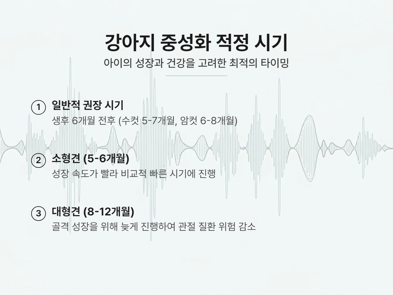 - 중형견/대형견: 뼈와 근육이 완전히 자라는데 1년에서 길게는 2년까지 걸릴 수 있습니다. 너무 일찍 중성화하면 호르몬 차단으로 성장판이 닫히는 시기에 영향을 줘 골격이 비정상적으로 자라거나 관절 질환 위험이 높아질 수 있다는 연구 결과도 있어, 8개월에서 12개월 사이에 수술을 진행하기도 합니다.