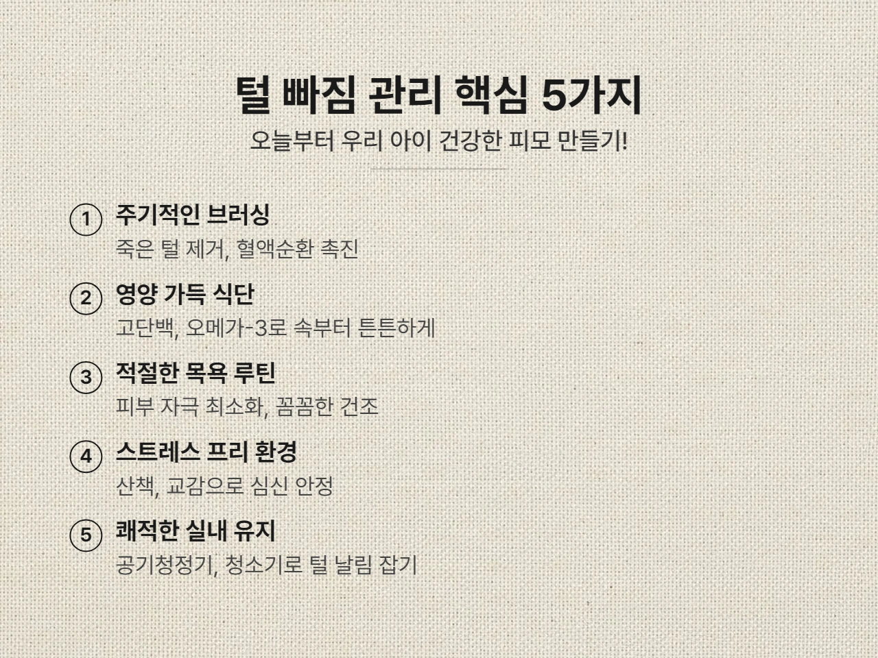 털 빠짐을 완전히 없앨 수는 없지만, 보호자의 꾸준한 노력으로 분명히 줄일 수 있습니다. 아래 5가지 방법을 참고하여 오늘부터 우리 아이의 털 관리에 신경 써보세요.