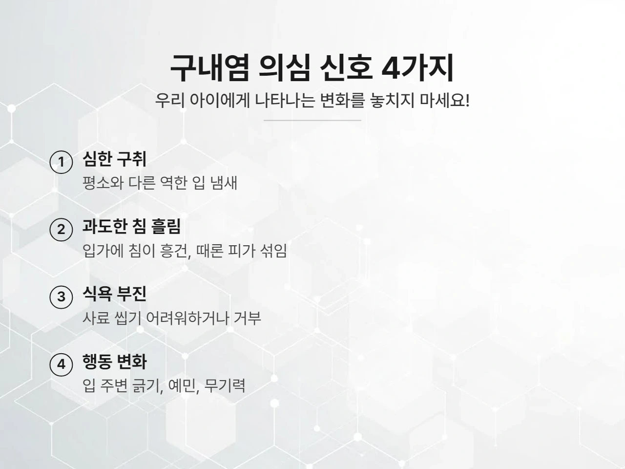 구내염은 단순히 입안의 문제로 끝나지 않고, 아이들의 전반적인 컨디션과 행동에도 영향을 미칠 수 있습니다. 저도 처음에는 대수롭지 않게 여겼다가 나중에 구내염으로 밝혀진 경우도 많아요.