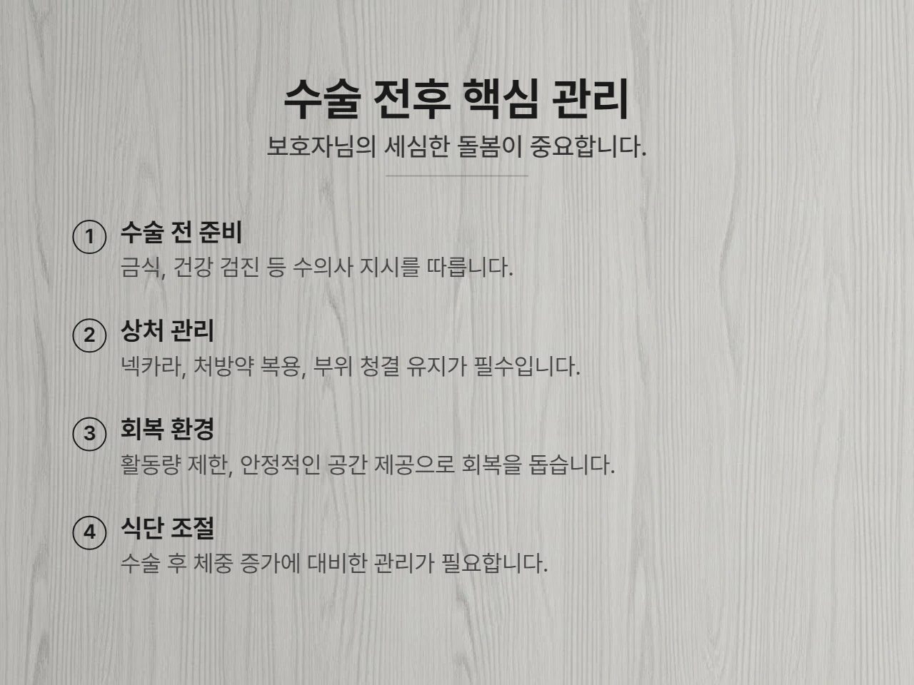 수술만큼이나 중요한 것이 바로 수술 전후의 철저한 관리입니다. 보호자님의 세심한 돌봄이 아이의 빠른 회복과 합병증 예방에 큰 영향을 미치기 때문이죠.