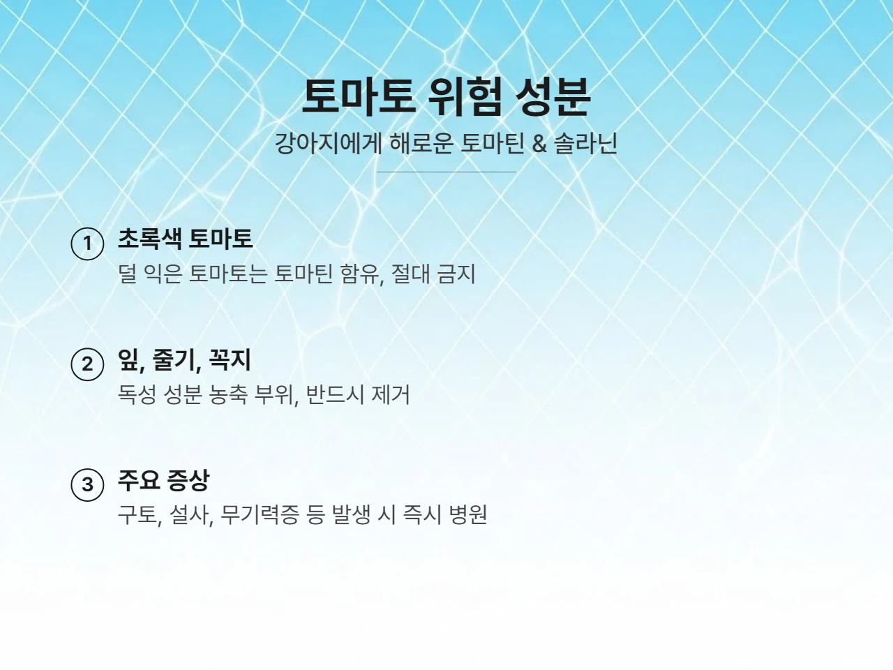 토마토의 매력을 알았다면, 이제 가장 중요한 주의사항을 알아볼 차례입니다. 토마토 속 특정 성분은 강아지에게 치명적일 수 있으니 반드시 숙지해야 합니다.