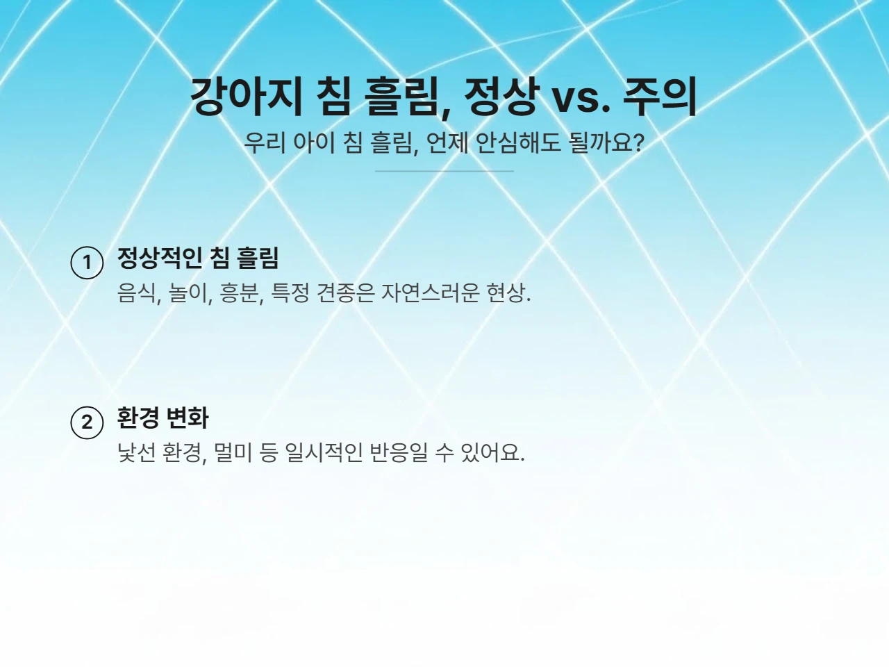 새로운 환경에 노출되거나, 낯선 사람이나 강아지를 만났을 때도 아이들이 긴장해서 침을 흘릴 수 있어요. 이것은 스트레스 반응의 일종인데, 대체로 일시적인 경우가 많죠.
