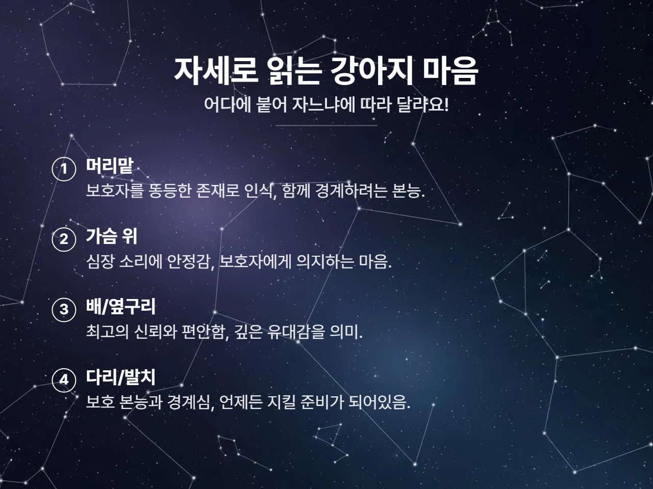 보호자의 규칙적인 심장 박동은 강아지에게 '괜찮아, 안전해, 내가 옆에 있어'라는 무언의 메시지를 전달합니다. 마치 엄마 뱃속에서 들었던 소리처럼 느껴져, 강아지는 이 소리에 기대어 깊은 평온함을 느끼게 되는 거죠. 이런 아이들은 특히 보호자에게 의존하는 경향이 있을 수 있습니다.