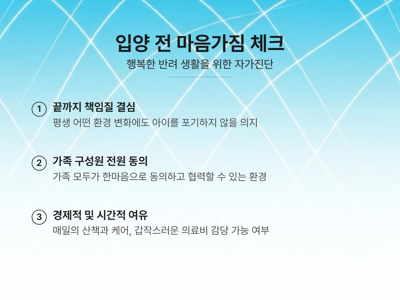 처음 입양을 진행할 때 아래 항목들을 중심으로 살펴보시면 큰 도움이 됩니다.