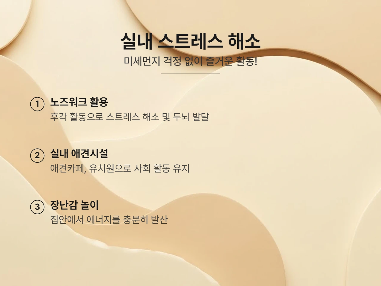 • 실내 애견카페 이용: 미세먼지 걱정 없이 넓은 공간에서 다른 강아지들과 어울릴 수 있는 좋은 대안이 될 수 있습니다.